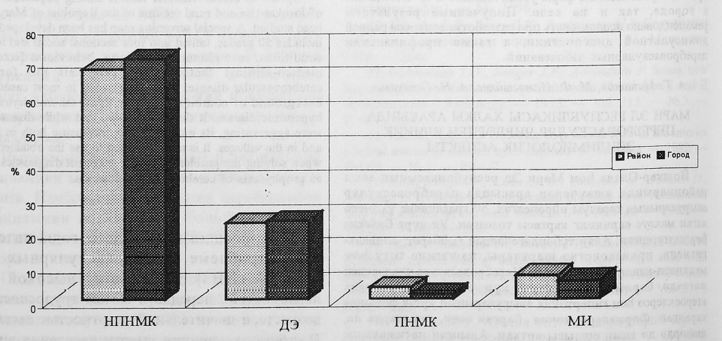 В результате анализа результатов скрининга репрезентативных выборов были выявлены 124 человека, больных ЦВЗ (мужчин — 23, женщин — 101) в Йошкар-Оле и 242 (74 и 168 соответственно) — на селе. Наибольшее число случаев и в городе, и в селах (рис. 1) приходится на долю начальных проявлений недостаточности мозгового кровообращения — НПНМК (70,2% и 67,3% соответственно от всей выявленной патологии), затем на дисциркуляторную энцефалопатию—ДЭ (22,6% и 22,3%), мозговой инсульт — МИ (5,6% и 7,0%) и преходящие нарушения мозгового кровообращения — ПНМК (3,6% и 3,3%).