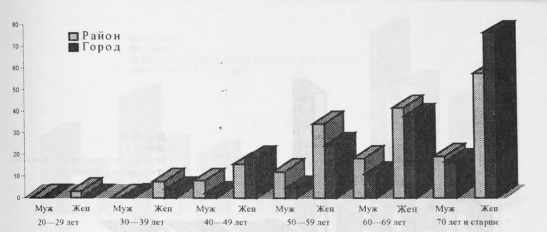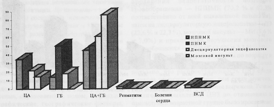 При анализе соотношений между возрастом, полом и основным сосудистым заболеванием установлено, что у лиц молодого возраста ведущую роль в формировании ЦВЗ в городе сыграли ЦА и ГБ (по 40%), в селах — ЦА (в группе от 20 до 29 лет — у 100%, от 30 до 39 лет — у 54,5%) и ГБ (в группе от 30 до 39 лет — у 45,5%). В возрасте 40—49 лет на ведущей позиции находится сочетание ЦА и ГБ (в городе — у 38,1%, на селе — у 30%), в группе от 50 до 59 лет это сочетание тоже является ведущим (в городе —у 34,4%, на селе — у 50%). Причем если в городе ГБ отстает незначительно, то на селе она отмечена лишь в 4 случаях (6,1%), ЦА же в группе от 60 до 69 лет занимает лидирующее положение (46,05%), частота сочетания ЦА и ГБ также высока (43,4%). В городе сочетание ЦА и ГБ сохраняет свои позиции (55,5%), хотя и доля ЦА велика (42,2%). Из анамнеза видно, что частота ГБ увеличивается лишь до определенного возрастного предела, в дальнейшем уступая место ЦА и его сочетанию с ней, а сам ЦА на селе выявляется в более раннем возрасте, чем в городе.