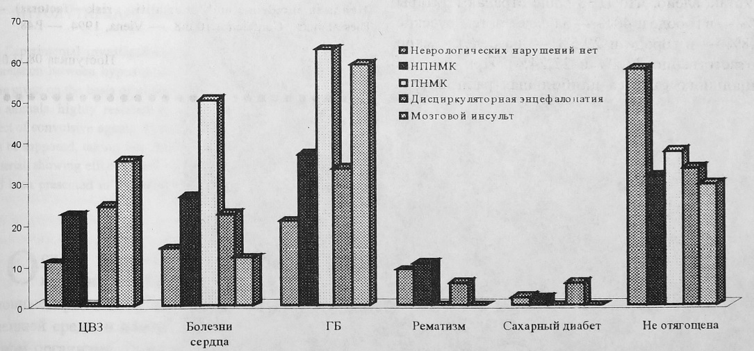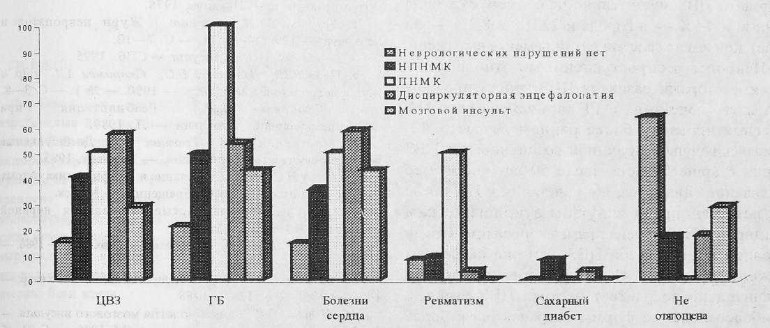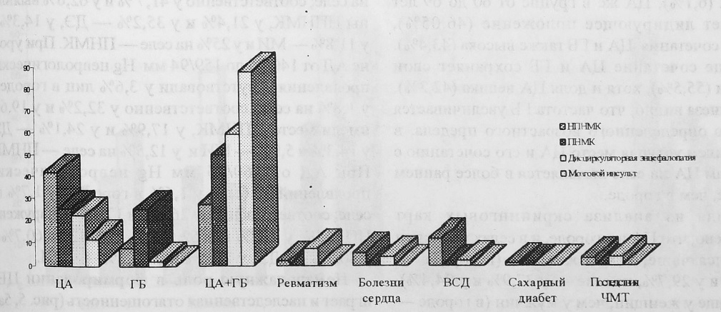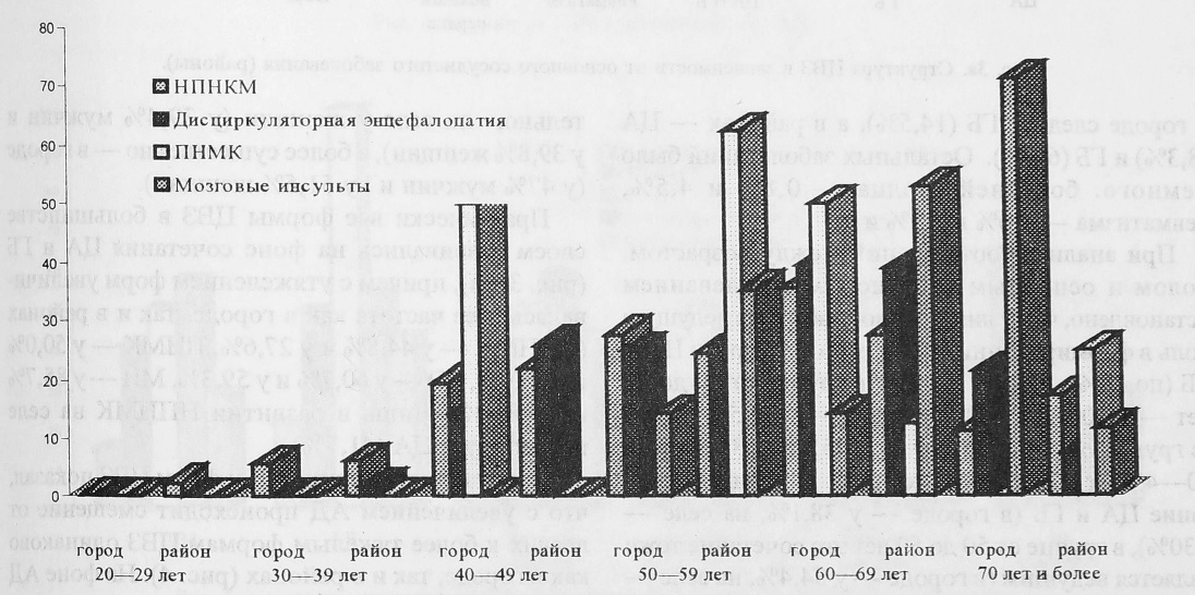 Практически все формы ЦВЗ в большинстве своем развивались на фоне сочетания ЦА и ГБ (рис. 3, 3а), причем с утяжелением форм увеличивалась и ее частота как в городе, так и в районах (НПНМК — у 44,8% и у 27,6%, ПНМК — у 50,0% и у 50,0%, ДЭ — у 60,7% и у 59,3%, МИ—у 85,7% и у 88,3%). Лишь в развитии НПНМК на селе превалирует ЦА (41,7%).