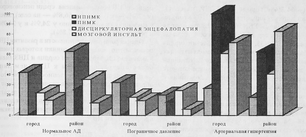 Анализ соотношений АД и форм ЦВЗ показал, что с увеличением АД происходит смещение от легких к более тяжелым формам ЦВЗ одинаково как в городе, так и в районах (рис. 4). На фоне АД до 140/90 мм Hg неврологических нарушений не было у 94,8% обследованных в городе и у 96,4% на селе; соответственно у 41,7 % и у 62,6% выявлены НПНМК, у 21,4% и у 35,2% — ДЭ, у 14,3% и у 11,8%—МИ и у 25% на селе—ПНМК. При уровне АД от 140/90 до 159/94 мм Hg неврологические проявления отсутствовали у 3,6% лиц в городе и у 1,8% на селе; соответственно у 32,2% и у 19,6% имели место НПНМК, у 17,9% и у 24,1% —ДЭ, у 14,3% и 5,9% — МИ и у 12,5% на селе — ПНМК. При АД от 160/95 мм Hg неврологических проявлений не было у 1,6% в городе и у 1,7% на селе; соответственно у 26,4% и 17,8% обнаружены НПНМК, у 100% и у 62,5% — ПНМК, у 60,7% и у 40,7% — ДЭ, у 71,4% и у 82,3% — МИ.