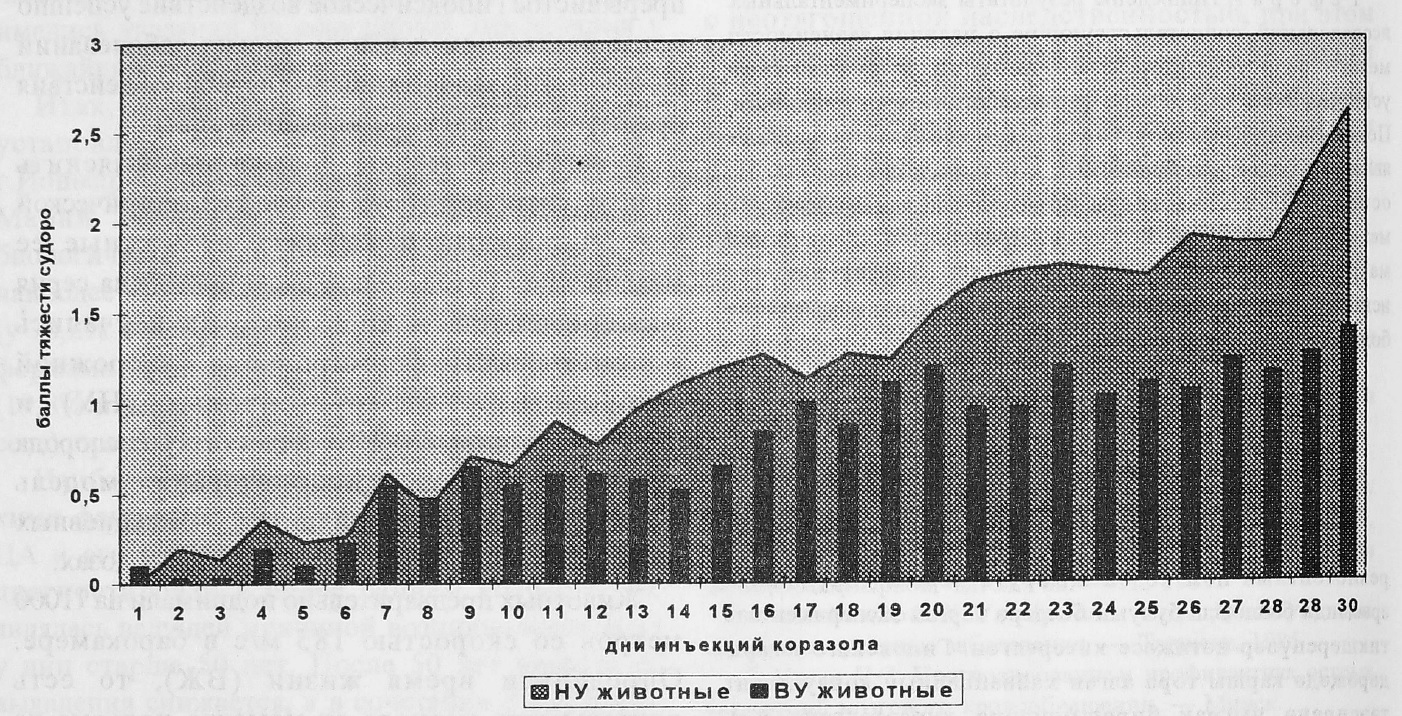 Первая реакция на введение подпороговой дозы коразола оказалась более выраженной у ВУ животных (рис.1). У 3 из них 1-я инъекция этого препарата вызвала судорожные реакции интенсивностью в 1 балл (миоклонические вздрагивания мышц морды, ушей, туловища). Однако уже начиная со 2-го введения интенсивность судорожных проявлений была выше у НУ к гипоксии животных.