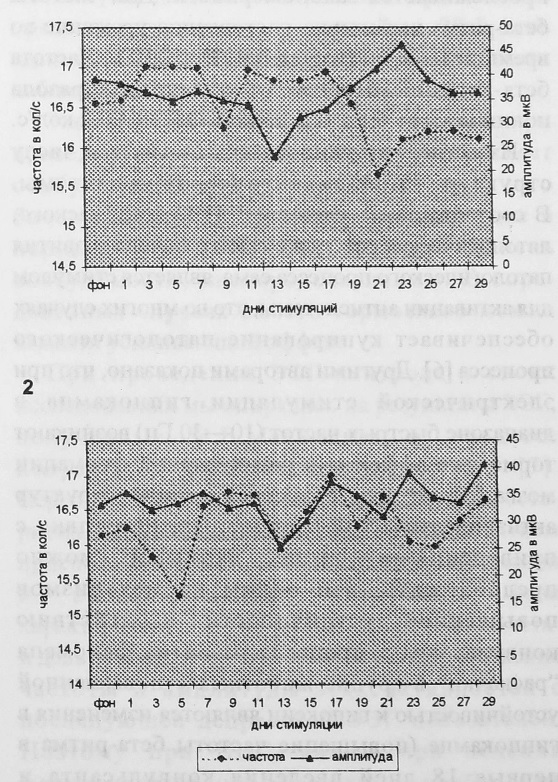 Динамика частоты и амплитуды дельта-активности в хвостатом ядре напоминает таковую в гиппокампе: медленное повышение амплитуды дельта-активности в процессе формирования феномена “раскачки” при незначительном замедлении ритма. Периоды наибольших и наименьших значений данных показателей в большинстве случаев совпадают в обеих структурах головного мозга. В то же время гиппокамп и хвостатое ядро существенным образом отличаются друг от друга характером изменения основных характеристик бета-активности по мере нарастания числа стимуляций. Так, в гиппокампе в первые 18 дней введения конвульсанта частота бета-активности значительно повышается, а амплитуда понижается. Уже после 13—14 введений коразола амплитуда бета-активности в гиппокампе достоверно снизилась с 39,1 ± 2,6 мкВ в фоне до 23,1 ± 6,5 мкВ (Р<0,05), и только на более поздних сроках киндлинга (после 18 дней стимуляции) обнаруживается противоположная закономерность.