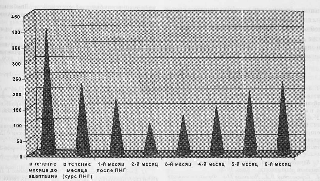 Отмечено, что адаптация к гипоксии привела к урежению и сокращению длительности припадков, облегчению постприступного состояния. У 34 больных после ПНГ количество припадков уменьшилось на 50% и более. Сокращение числа припадков отмечалось уже при проведении сеансов ПНГ— почти в 2 раза по сравнению с фоновыми данными (рис. 3). Если в течение месяца до адаптации общее количество припадков у этих больных составляло 402, то в течение курса ПНГ оно сократилось до 227. Минимальное количество приступов наблюдалось в течение первых 4 месяцев после окончания тренировочного курса (соответственно 177, 99, 124 и 154). После этого срока эпилептические припадки несколько участились и на 6-м месяце составили 235.