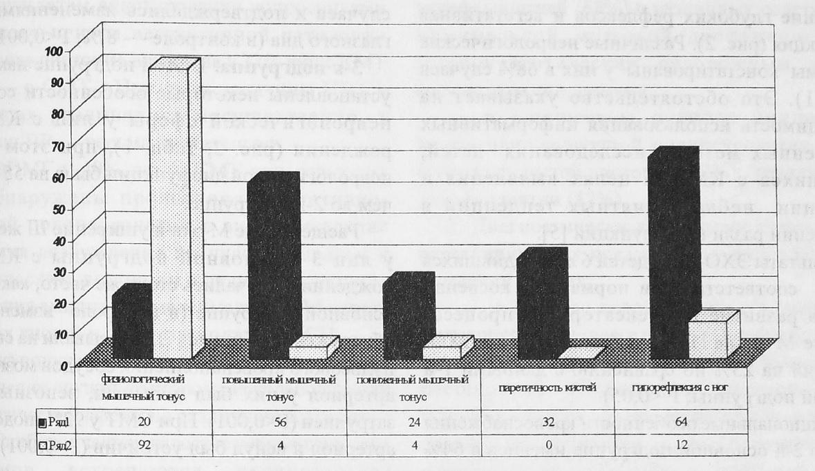 Рис. 3. Изменения неврологического статуса у лиц 3-й возрастной подгруппы в зависимости от массы тела при рождении (для всех случаев Р<0,05). Ряд 1 — параметры группы с КМТ; ряд 2 — параметры группы с СМТ.