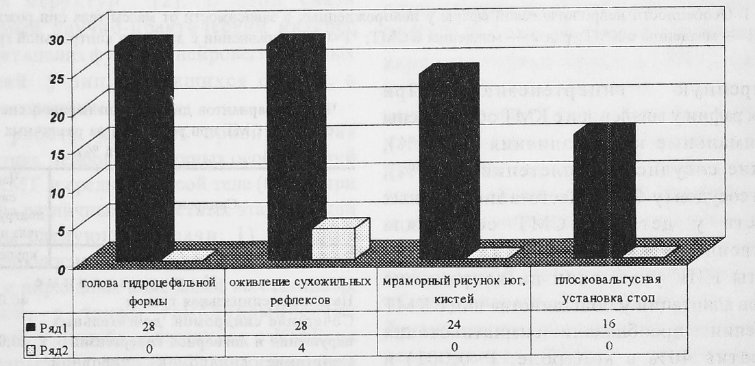 Варианты дисфункции нервной системы, выделенные нами при сопоставлении клинико-параклинических показателей (табл. 1), послужили основанием для диагностики перинатальной энцефалопатии у новорожденных с КМТ в 76 % случаев, в том числе в 40% она сочеталась с натальной спинальной травмой [4]. Частота перинатальной энцефалопатии при СМТ составляла 8% (Р<0,001).