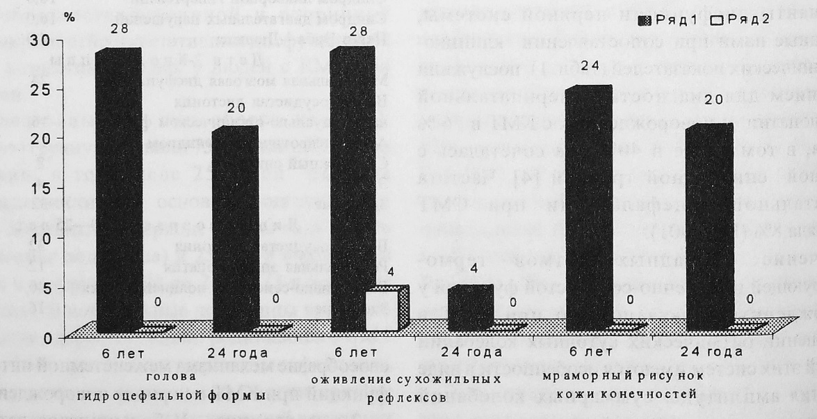 2-я подгруппа. У большинства детей 2-й подгруппы, родившихся с КМТ, отмечены оживление глубоких рефлексов и вегетативная дисфункция (рис. 2). Различные неврологические синдромы констатированы у них в 68% случаев (табл. 1). Это обстоятельство указывает на необходимость использования информативных современных методов исследования детей, родившихся с КМТ, в целях выявления и коррекции неблагоприятных тенденций в становлении различных функций [5].