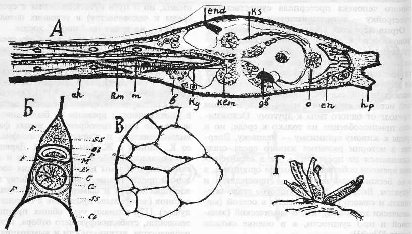 А — продольный разрез: hp — прикрепительные сосочки, еn — эндостиль, о — ротовое отверстие, gb — мозговой пузырь, klm — клоакальное выпячивание, Rg — туловищный ганглий, b — кровяные тельца, m — мускулы хвоста, Rm - спинной мозг, ch — хорда, end — задняя кишка, Ks — жаберная щель (из А.О.Ковалевского);