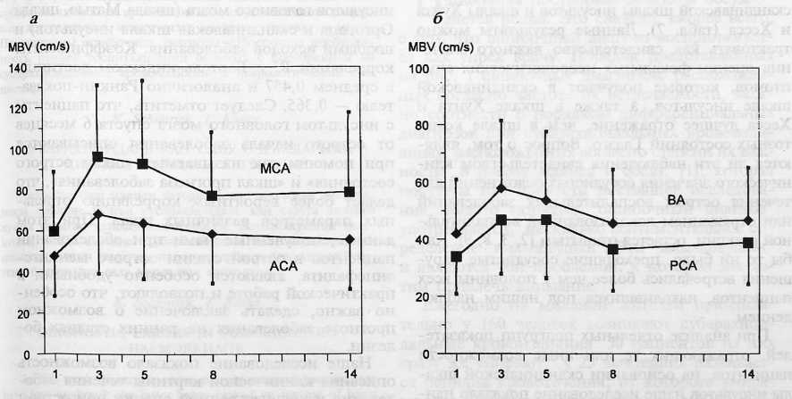 а — в средней (MCA) и передней мозговой артерии (АСА); б — в задней мозговой артерии (РСА) и в основной артерии (ВА) у 43 пациентов с бактериальным менингитом (среднее значение ± стандартное отклонение от среднего значения).