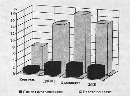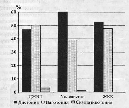 У детей с ДЖВП преобладала ваготония (50% больных в данной группе). При хроническом холецистите и ЖКБ был в основном смешанный тип ИВТ (соответственно 60% и 52,4 % больных в данных группах), при этом у детей с хроническим холециститом дистония встречалась достоверно чаще (Р<0,05), чем ваготония (рис.1, табл. 1).