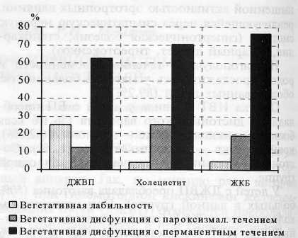 Признаки вегетативной лабильности отмечались у 8,8 % детей, чаще при функциональных расстройствах ЖВС (25 % больных ДЖВП).