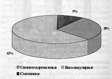 Пароксизмальное течение ВД отмечалось у 21,6% больных, чаще наблюдались ваго-инсулярные кризы (13,5% от общего числа больных), в 2 раза реже — симпато-адреналовые пароксизмы. У 3 больных кризы имели смешанный характер (рис. 4). Чаще вегетативные кризы возникали у детей с хроническим холециститом (25,3% больных в данной группе). У четверти обследованных развивались обморочные пароксизмы, чаще при хроническом холецистите, при этом преобладали неврогенные (вазовагальные, ортостатические) обмороки. Во всех наблюдениях ВК сочетались с перманентными расстройствами ВНС.