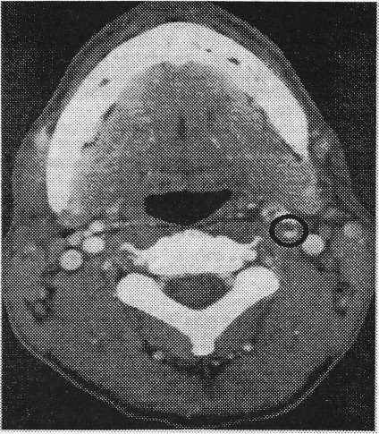 Рис. 1. Наблюдение 2. Компьютерная томограмма мягких тканей шеи с контрастным веществом. Диссекция левой внутренней сонной артерии (отмечено кругом).