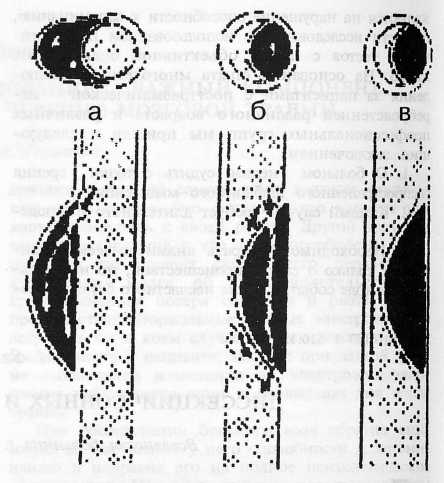 Рис. 2. Схематичное представление трех типов диссекции: а) диссекция со стенозом сосуда; б) диссекция с ложным просветом сосуда в области стеноза сосуда; в) псевдоаневризма.