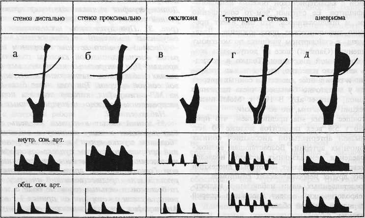 Рис. 3. Схематичное представление различных типов диссекции и соответствующих им данных допплерной сонографии.
