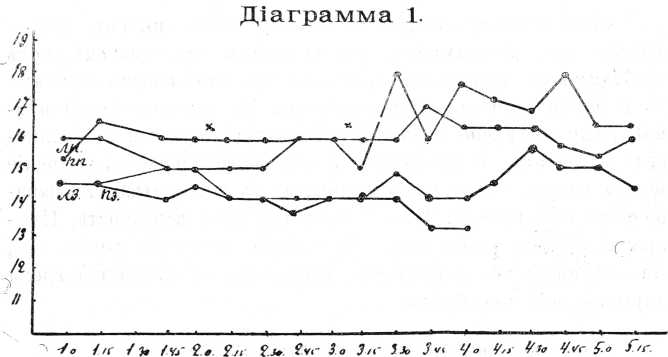Сообщаемъ протокольныя записи нашихъ опытовъ, сопровождая ихъ діаграммами, на которыхъ представленъ ходъ возбудимости корковыхъ центровъ въ отдѣльныхъ опытахъ до и послѣ впрыскиванія церебрина. На горизонтальной прямой нами отмѣчено время изслѣдованія корковой возбудимости въ часахъ и минутахъ, а на вертикальной—разстояніе между катушками саннаго аппарата, въ сантиметрахъ. Сокращенныя обозначенія: Пп—правая передняя конечность, Пз— правая задняя конечность, Лп—лѣвая передняя конечность, Лз—лѣвая задняя конечность. Крестикомъ обозначается время впрыскиванія церебрина.