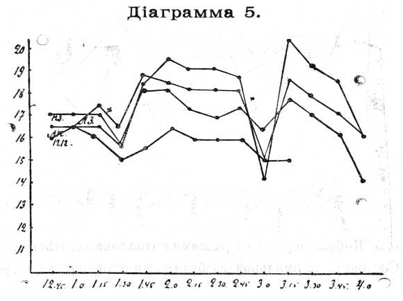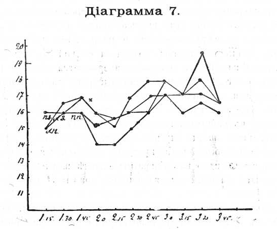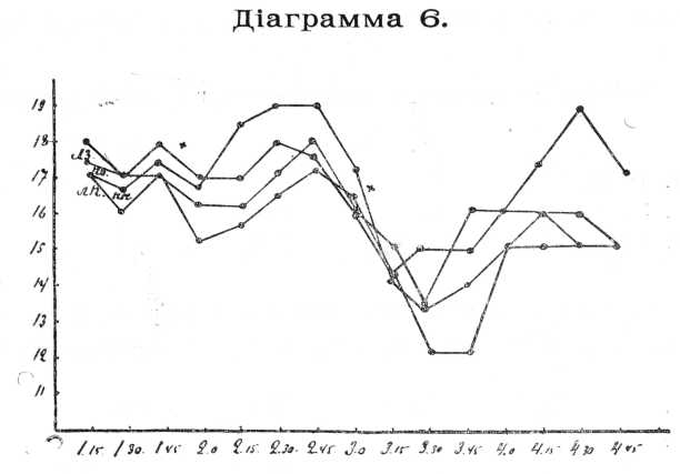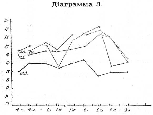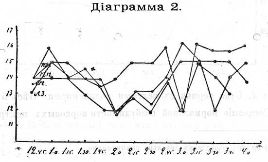 Къ протокольной записи опыта 1-го и послѣдующихъ опытовъ нерѣдко встрѣчаются двойныя цифры, обозначающія состояніе возбудимости корковыхъ центровъ; этимъ указывается. что первое движеніе было вызвано при болѣе сильномъ раздраженіи, а затѣмъ оно получилось и при раздраженіи болѣе слабомъ, или, что раздраженіе болѣе слабое не давало достаточно сильнаго движенія конечности, такъ что приходилось усиливать раздраженіе для полученія движенія постоянной силы. Въ томъ и другомъ случаѣ въ діаграммахъ мы беремъ среднія цифры.