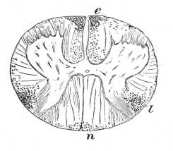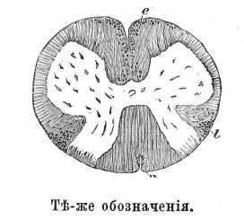 1) Перерожденіе пирамиднаго пучка, е) перерожденіе передне-краевого пучка Löwenthal’n и n) перерожденіе волоконъ задняго столба, располагающееся въ нижне-грудной и поясничной области на периферіи заднихъ столбовъ, а въ нижне-поясничной и верхне-крестцовой занимающее овальное поле по бокамъ septum. (Рис. 1 и 2).