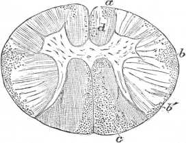 Въ заднихъ столбахъ перерожденіе занимало периферію заднихъ столбовъ, располагаясь главнымъ образомъ на задней периферіи пучка Goll’a, а такъ же въ задне-внутренней части пучка Burdach’a.