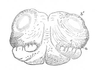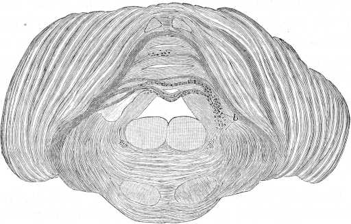 b и b') Волокна прямого мозжечковаго пучка (b'), перерожденіе которыхъ доходитъ до верхняго червя и волокна пучка Gowers’a (b), оканчивающіяся въ нижнемъ червѣ. (Рис. 3, 4, 5 и 6).