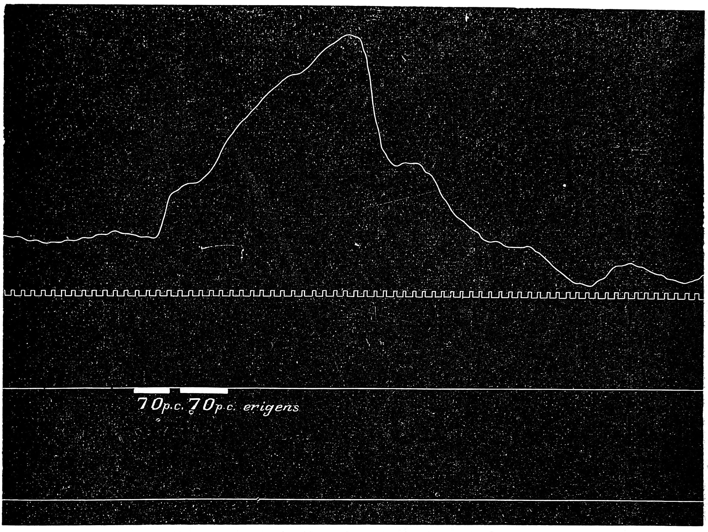 Сказывалось оно въ небольшомъ начальномъ поднятіи кривой (до начала разслабленія продольной мускулатуры) и въ нѣсколькихъ поднятіяхъ въ теченіе паденія кривой.