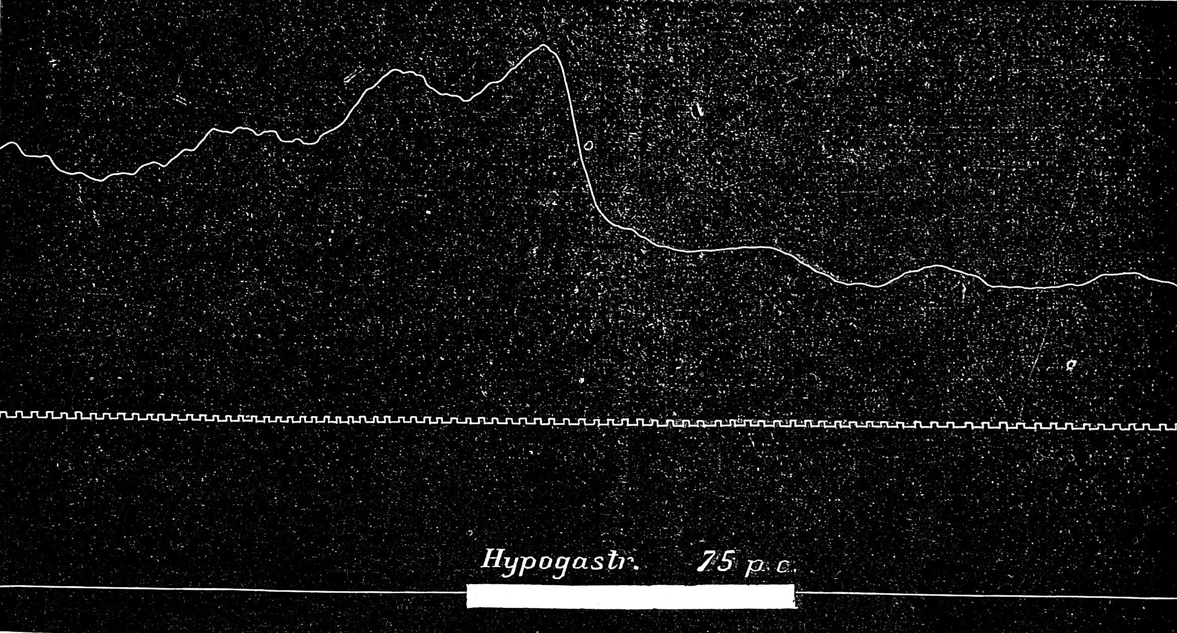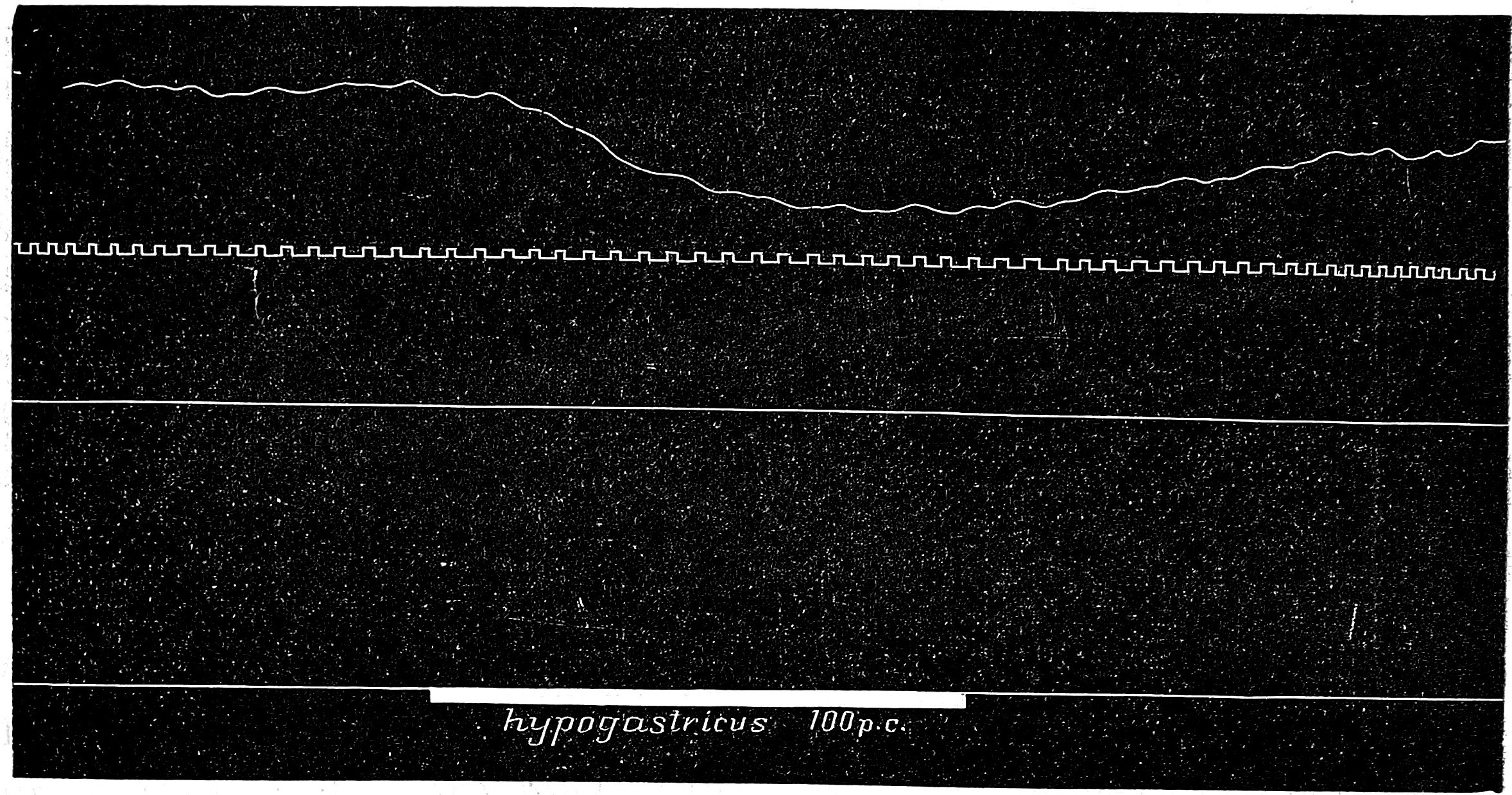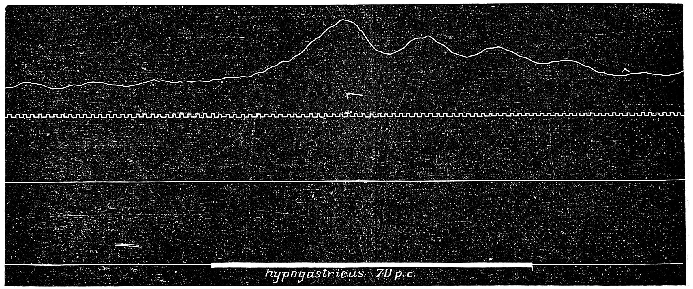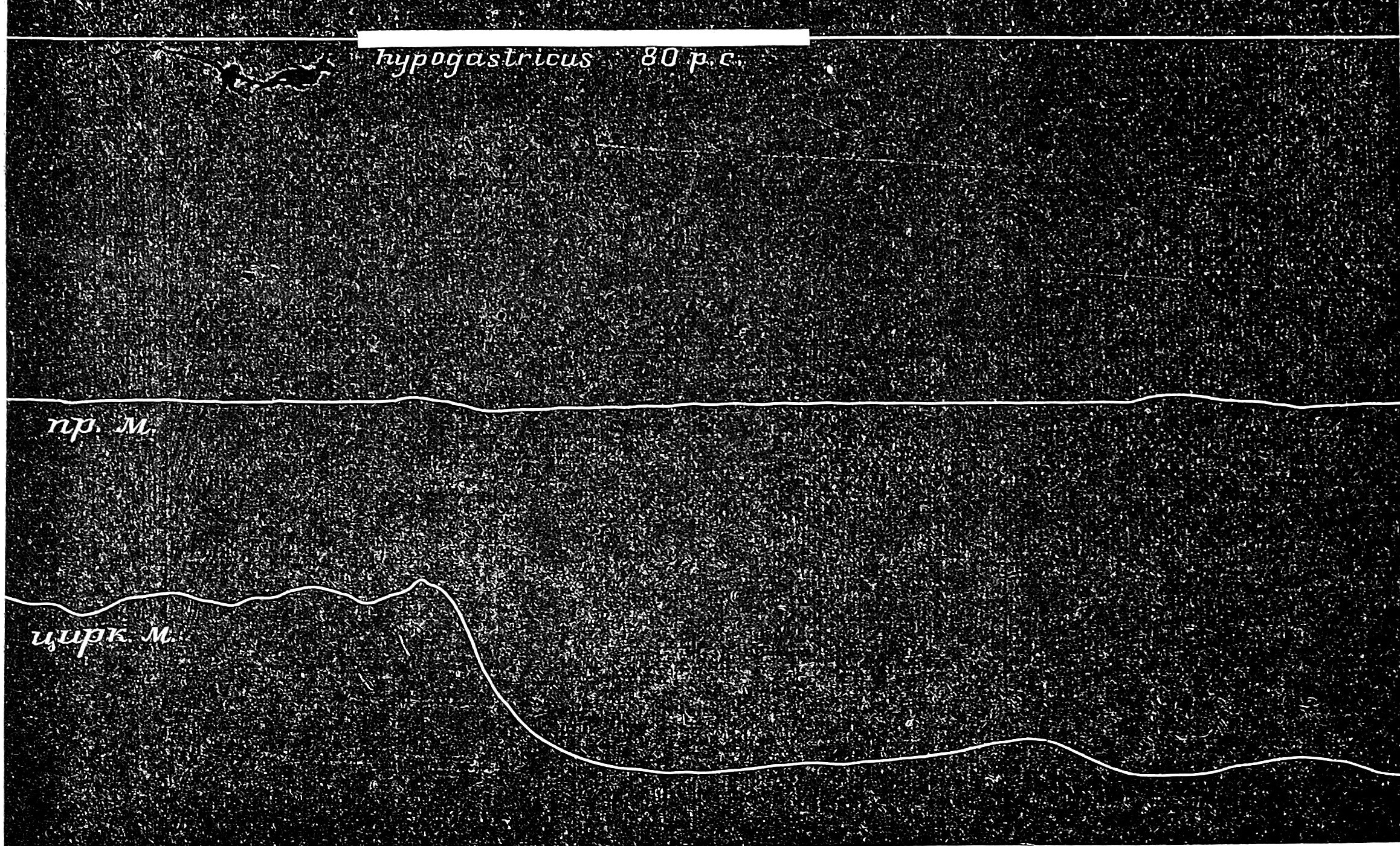 Кривая раздраженія hypogastrici характеризовалась значительнымъ волнообразнымъ подъемомъ. Что этотъ подъемъ былъ вызванъ сокращеніемъ круговой мускулатуры, то это по Fellner’y явствуетъ изъ волнообразнаго вида кривой, т. к. наблюденія надъ свободно лежащимъ отрѣзкомъ кишки показываютъ, что круговая мускулатура сокращается не вся заразъ, а перистальтически—отъ отдѣла къ отдѣлу, между тѣмъ какъ продольная мускулатура, сокращаясь, производитъ укороченіе по всей длинѣ recti, а не въ отдѣльныхъ участкахъ.