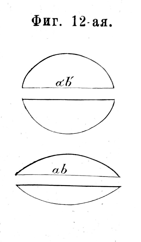 При одновременномъ разслабленіи обѣихъ мускулатуръ, наступающее увеличеніе полости ведетъ за собой наполненіе баллона водой и, слѣдовательно, измѣненіе конфигураціи кишечнаго отрѣзка въ смыслѣ приближенія его цилиндрической формы въ формѣ болѣе шаровидной. Такимъ образомъ, если до начала раздраженія длина кишечнаго отрѣзка регистрировалась въ длинѣ линіи ab (см. фиг. 12), то въ моментъ появленія депрессіи и съ наступленіемъ расширенія полости линія ab можетъ не только нисколько не увеличиться, но, наоборотъ, стать даже меньше своей прежней величины и приблизиться къ длинѣ линіи db' все будетъ зависѣть отъ того, насколько возрастутъ поперечные размѣры цилиндра.