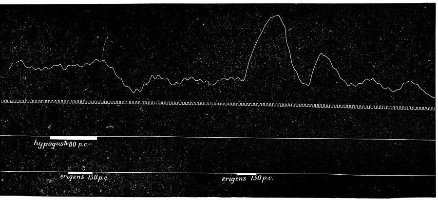 Раздраженіе n. hypogastrici въ опытахъ Fellnerʹa на кишечномъ кольцѣ, растянутомъ поперекъ, иллюстрируется слабой моторной кривой, происхожденіе которой также относится имъ всецѣло на сокращеніе циркулярнаго слоя.