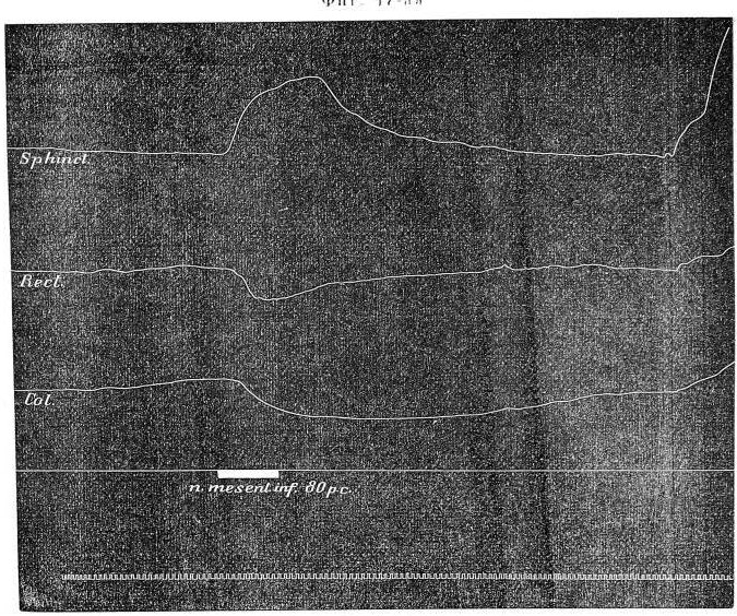 Заканчивая главу изслѣдованія толстой кишки при одновременной регистраціи трехъ ея отдѣловъ (colonis, recti и spinnet, inter.), мы отмѣтимъ, что во всѣхъ опытахъ съ тройной регистраціей участіе дѣйствія наружнаго сфинктера—въ полученныхъ эффектахъ состоянія запирательнаго аппарата кишки подъ вліяніемъ раздраженія симпатическихъ нервовъ ея и нервовъ еrigentʹовъ—вполнѣ исключалось на основаніи факта иннерваціи его вѣтвями n. pudendi comminis и особеннаго характера кривыхъ сокращенія, полученныхъ нами въ двухъ спеціально поставленныхъ съ этой цѣлью опытахъ.