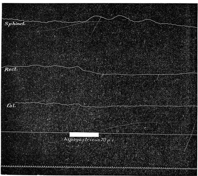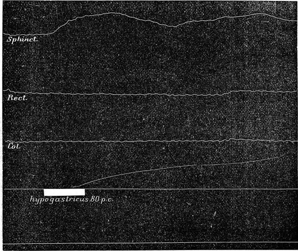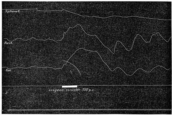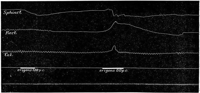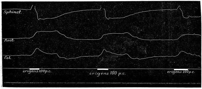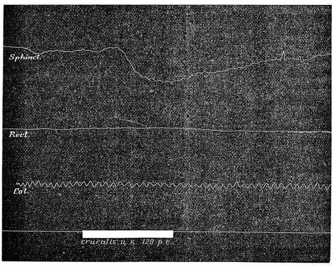 Возможно, что въ данномъ случаѣ дѣло сводилось къ дефекту метода въ томъ смыслѣ, что въ нижнемъ отдѣлѣ кишки, какъ мы тутъ же имѣли возможность установить, скопилось довольно значительное количество кала. Послѣдній, передвигаясь ниже при сокращеніи верхнихъ отдѣловъ, давилъ на эксплораторъ, находящійся въ отдѣлѣ внутренняго сфинктера и такимъ образомъ мѣшалъ сказаться дѣйствительному эффекту на кривой.