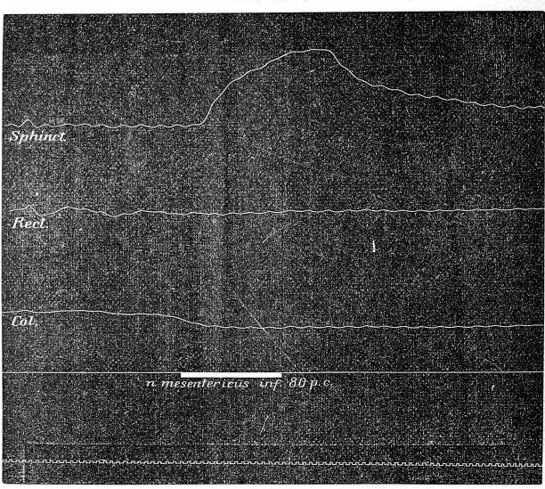 Въ заключеніе разсмотрѣнія дѣйствія n. erigentis, на запирательный аппаратъ и вышележащіе отдѣлы толстой кишки, считаемъ нужнымъ отмѣтить, что въ нѣкоторыхъ опытахъ мы наблюдали депремирующее дѣйствіе n. erigentis на внутренній сфинктеръ при тѣхъ силахъ тока, которыя оказывались недостаточными для проявленія моторнаго дѣйствія n. erigentis въ вышележащемъ отдѣлѣ толстой кишки.