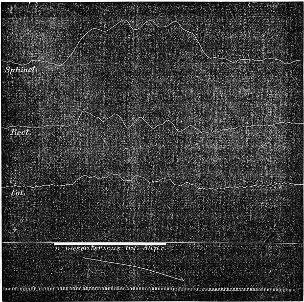 Быть можетъ здѣсь были и другія какія-либо причины, но фактъ тотъ, что контроль глазомъ и наощупь убѣдилъ насъ въ томъ, что въ извѣстномъ рядѣ случаевъ, получая при раздраженіи n. erigentis моторный эффектъ во всѣхъ трехъ отдѣлахъ кишки, мы имѣемъ дѣло съ дефектомъ метода, ибо несомнѣнно, что въ громадномъ большинствѣ случаевъ обычнымъ результатомъ раздраженія n. erigentis по отношенію ко внутреннему сфинктеру, будетъ разслабленіе его.