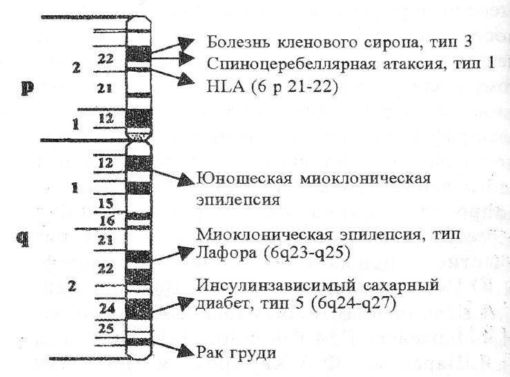 В целях уточнения вклада генетических факторов при синдромах ВД в течение ряда лет на кафедре проводятся исследования с использованием современных методов генетического анализа. Среди генетических маркерных систем одной из наиболее информативных считается HLA-система, расположенная на коротком плече 6-й хромосомы (рис. 2). В результате исследований HLA- фенотипа, проведенных на кафедре А.А. Курмышкиным, были установлены, во-первых, уникальность HLA-профиля казанской популяции, включающей отдельно русских и татар, и, во-вторых, наличие трех наиболее часто встречаемых антигенов А9, В12 и В35 в группе больных с паническими атаками (ПА) и антигенов А2 и В35 при нейрогенных обмороках (НО).
