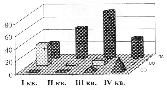 Рис. 4. Распределение вегетативных пароксизмов в квартилях скорости Na+—Li+-противотранспорта (%). Обозначения: ПА — панические атаки, ВО — вазодепрессорные обмороки, ОО — ортостатические обмороки (р<0,0001;χ 2=72,03 при сравнении между квартилями)