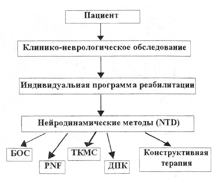 Научно-практический интерес представляют работы В.А. Исановой. В процессе решения некоторых задач реабилитации двигательного дефицита больных удалось разработать научно-обоснованный алгоритм диагностических и лечебных мероприятий (рис. 6), который включает модифицированные современные нейродинамические методы кинезиотерапии. Применение данной системы позволило более чем в два раза поднять эффективность результатов вмешательства при парезах и параличах. Эти эффективные разработки поддержаны Минздравами РТ и РФ и внедряются в широкую сеть лечебных и реабилитационных учреждений.