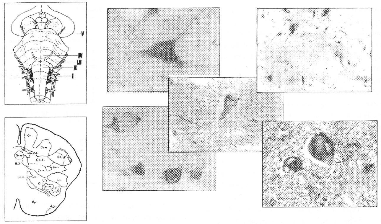 - Первые исследования, посвященные цереброваскулярным заболеваниям, нами были осуществлены еще при жизни моего учителя проф. Л.И. Оморокова. Изучение ядерных образований ствола головного мозга при гипертонической болезни и атеросклерозе показало значительные изменения хронического характера преимущественно в нейронах гигантоклеточного и парагигантоклеточного ядер РФ, которым придают роль сосудодвигательного центра (рис. 7). Было сделано заключение о том, что патогистологическая картина гигантоклеточных ядер ствола мозга может служить морфологическим субстратом грубых нарушений функции сосудодвигательного центра, приводя к сосудистым мозговым катастрофам.