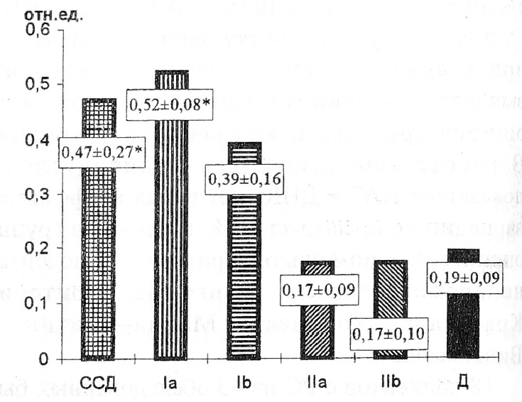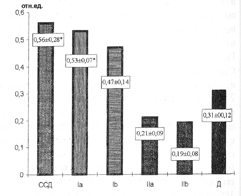 Рис. 1. Уровень сывороточных ААТ к дДНК у больных PC, ССД и доноров. Обозначения: Д — доноры, Iа — PC, I стадия, обострение, Ib — PC, I стадия, ремиссия, IIа — PC, II стадия, обострение, IIb — PC, II стадия, ремиссия. То же на рис. 2. * р<0,05.