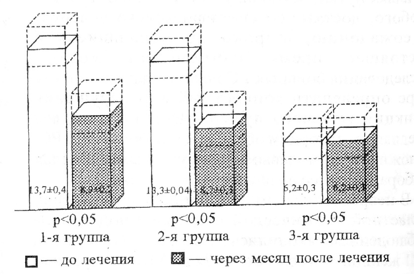 Через один месяц наблюдения у больных всех трех групп отмечено улучшение. Исследования показали, что в 1-й группе за истекший период частота мочеиспускания в сутки снизилась достоверно на 35% (р<0,05) с 13,7±0,4 до 8,9±0,2 (рис.1) и уменьшилось количество императивных позывов.
