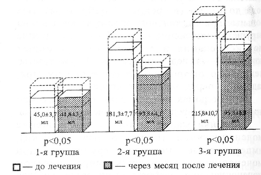 Во 2-й группе, наряду с уменьшением частоты мочеиспускания на 34% с 13,3±0,4 до 8,7±0,3 (рис.1), отмечено уменьшение количества остаточной мочи достоверно на 48% со 181,3±7,7 мл до 93,8±4,1 мл (рис.2). У пациентов 3-й группы количество остаточной мочи (рис.2.) приблизилось к нормальным показателям, снизившись достоверно на 55% с 215,8±10,7 мл до 95,8±6,8 мл.