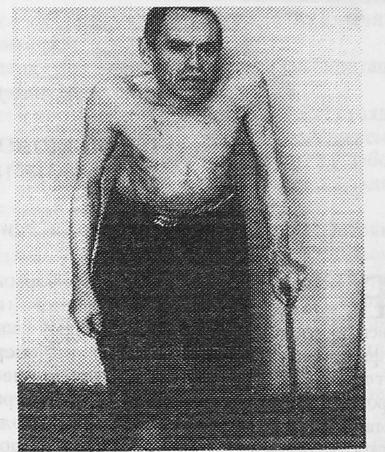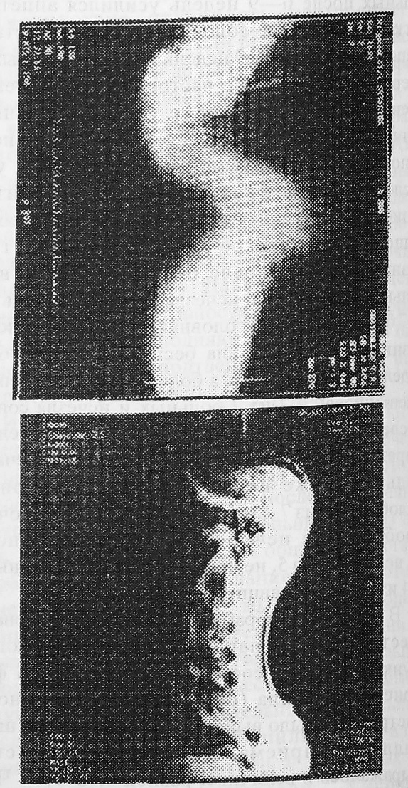 Больной Ш., 50 лет, поступил в научно-исследовательский центр Татарстана “ВТО” 17 января 2001 г. из неврологического отделения 6-й городской клинической больницы г. Казани с диагнозом: нижняя параплегия, кифосколиоз грудного отдела позвоночника. При поступлении жаловался на отсутствие движений в нижних конечностях, затрудненную дефекацию. В пятилетнем возрасте получил травму позвоночника, попав под колесо телеги, после этого развивалась тяжелая кифотическая деформация грудного отдела. В марте 2000 г. после поднятия тяжести почувствовал резкие боли в спине. 3 августа 2000 г. боли в спине усилились, появилась слабость в ногах, которая прогрессировала до полного отсутствия движений в нижних конечностях. С 17 октября 2000 г. по 17 января 2001 г. лечился в неврологическом отделении Казанской городской клинической больницы № 6, но улучшения не наступило.