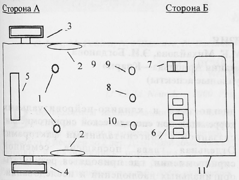 Рис. 2. Схематический вид прибора «Энцефалотест» (вид сверху). Сторона А, обращенная к обследуемому: 1 — светодиоды (световой раздражитель); 2 — телефоны (звуковой раздражитель); 3 и 4 — регулировочные ручки; слева — частоты световых вспышек светодиодов, справа — частоты звуковых щелчков в телефонах; 5 — клавиша включения и выключения двух раздражителей (а также включения и выключения секундомера); Сторона Б, обращенная к испытателю: 6 — цифровые индикаторы; 7 — переключатель выбора режимов работы прибора «секундомер»—«частотомер»; 8 — кнопка «установка 0»; 9 и 10 — кнопки коммутации импульсов световых вспышек и звуковых щелчков для измерения их частоты (могут быть установлены сбоку); 11 — ручка для переноски прибора.