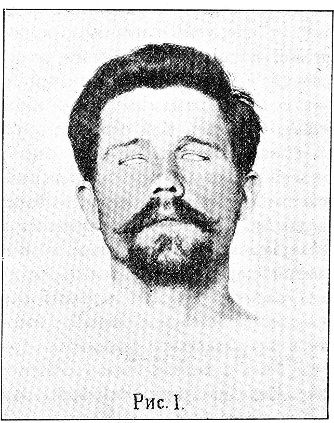Присутствующій здѣсь больной уже около мѣсяца находится въ нашей клиникѣ. За это время состояніе его здоровья замѣтно измѣнилось къ лучшему; тѣмъ не менѣе и теперь нѣтъ необходимости долго всматриваться въ его лицо, чтобы открыть на немъ яркіе слѣды страданія. Въ самомъ дѣлѣ, всѣмъ Вамъ, конечно, сразу кидается въ глаза совершенно неподвижное, застывшее выраженіе лица нашего паціента (см. рис. I); на немъ надѣта какъ-бы маска, вдобавокъ сдѣланная довольно грубо: на кожѣ лба нѣтъ обычныхъ продольныхъ морщинъ, носогубныя складки на обѣихъ сторонахъ равномѣрно сглажены, нижняя губа отвисла. Неподвижность лица еще болѣе рѣзко выступаетъ при попыткахъ къ мимическимъ движеніямъ.