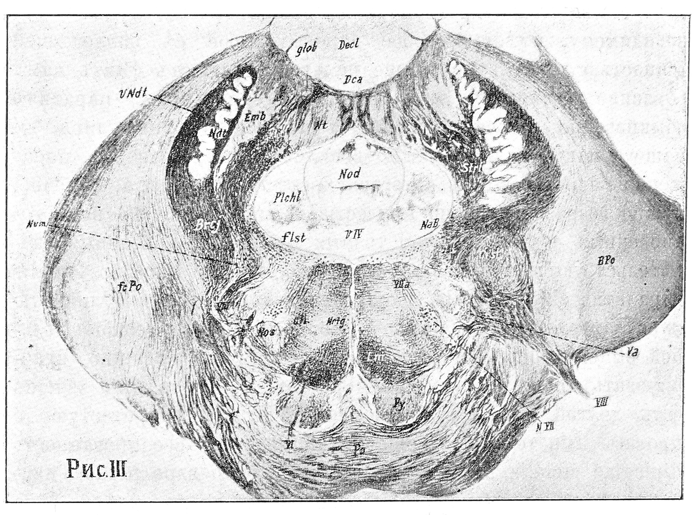 Параличи личнаго нерва, вызванные пораженіемъ центральныхъ путей, въ клиническомъ отношеніи представляютъ много общаго съ картиной параличей корковаго происхожденія. Разница лишь та, что если при корковыхъ страданіяхъ въ исключительно рѣдкихъ случаяхъ возможно встрѣтить процессъ, занявшій только область ѴП-ой пары, то при болѣе глубокой локализаціи такая случайность невозможна: центральные пути личнаго нерва на всемъ протяженіи тѣсно примыкаютъ къ пирамиднымъ путямъ и могутъ поражаться лишь вмѣстѣ съ послѣдними. Отсюда ясно, почему параличъ личного нерва обязательно сочетается при этомъ условіи съ гемиплегіей и чаще всего на той же сторонѣ 2). Само собой при пораженіи ядеръ ѴП-ой пары мы получимъ совершенно иную картину, несравненно ближе напоминающую ту(?) какую наблюдаемъ сегодня. Взгляните на эту схему (рис. III).