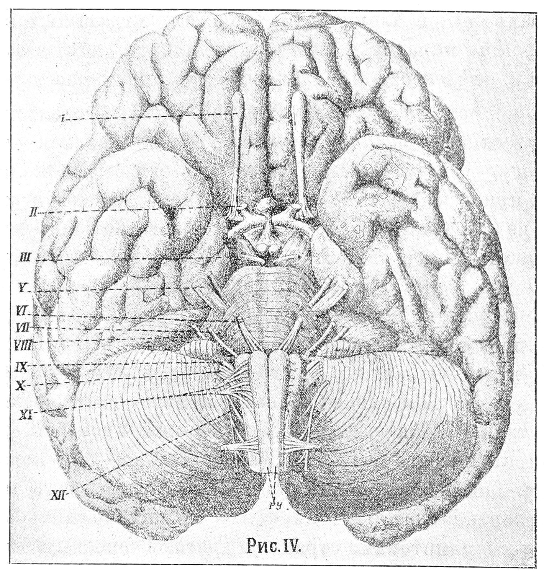 Но посмотримъ, нельзя ли еще точнѣе локализировать патологическій процессъ. Периферическіе параличи личного нерва могутъ развиться при пораженіи его ствола въ полости черепа, при прохожденіи его въ костномъ каналѣ и уже по выходѣ изъ послѣдняго наружу. У нашего больного мы констатировали разстройство вкуса на передней поверхности языка, а Вы знаете, что вкусовыя волокна оставляютъ стволъ личного нерва вмѣстѣ съ chorda tympani. Слѣдовательно, область пораженія должна лежать во всякомъ случаѣ выше этого пункта. Очевидно, гипотеза о заболѣваніи нерва по выходѣ его изъ костнаго канала должна быть оставлена. Нельзя также думать, чтобы болѣзненный процессъ развернулся и въ полости черепа. Дѣйствительно, при пораженіи ствола n. facialis въ толщѣ Вароліева моста, какъ мы уже знаемъ, картина паралича лицевыхъ мышцъ должна была бы осложняться симптомами страданія другихъ черепныхъ нервовъ. Тоже самое слѣдуетъ сказать и о локализаціи на днѣ черепной ямки. Это съ достаточной наглядностью свидѣтельствуетъ предъявляемая Вамъ схема (рис. IV).