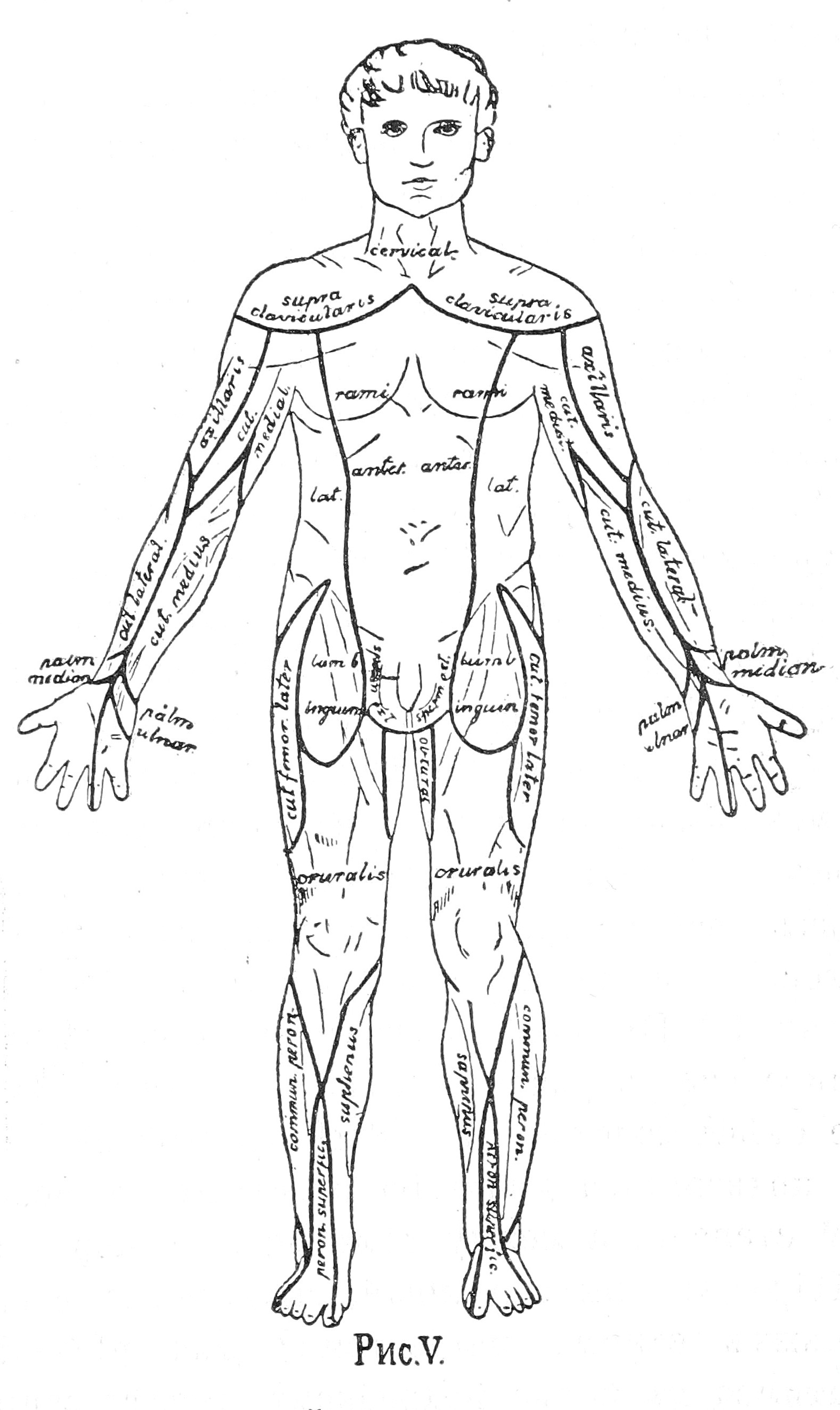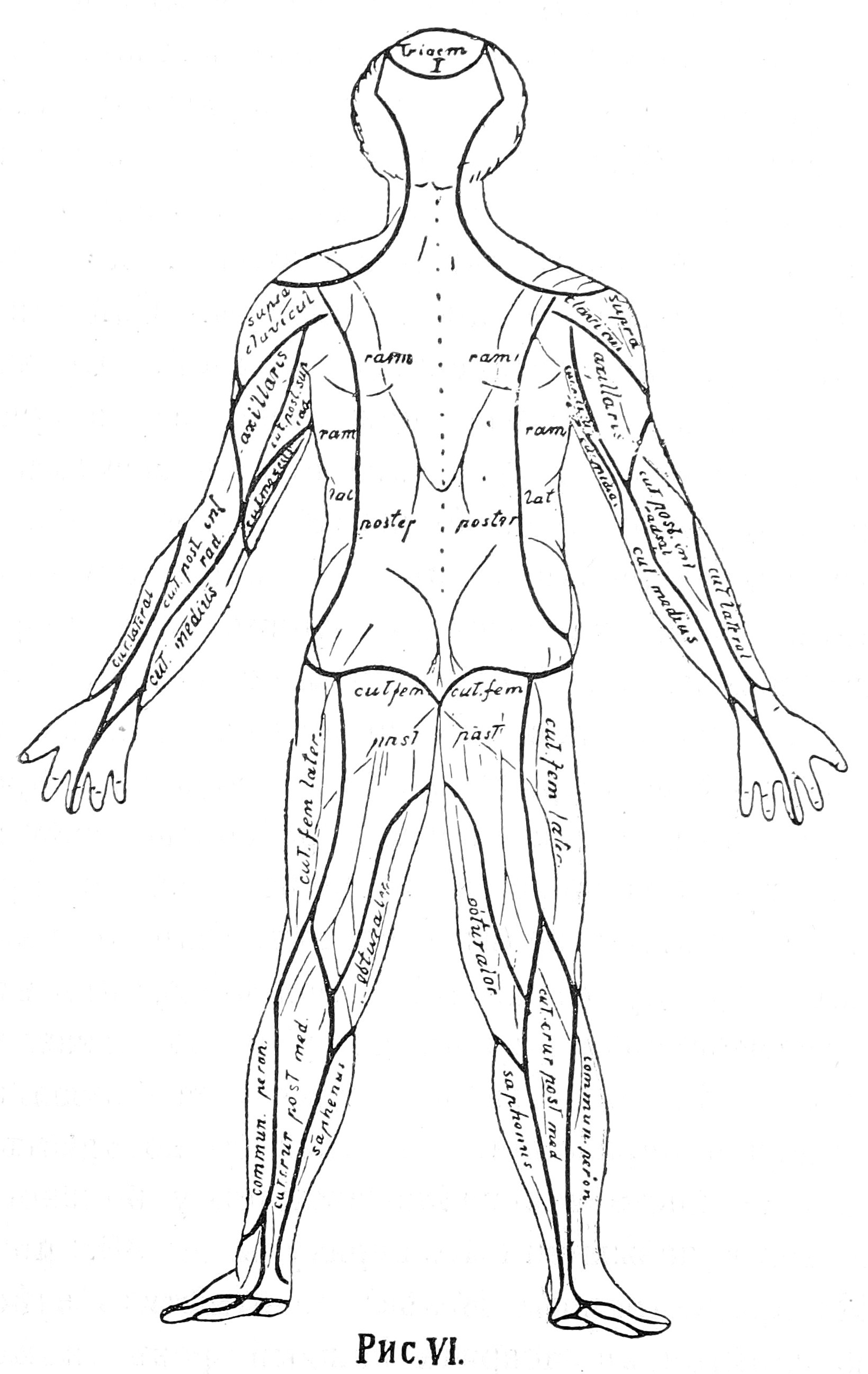 Соотвѣтственныя терапевтическія мѣропріятія (покой, гальванизація анодомъ) уже въ нѣсколько дней смягчили всѣ эти явленія, а черезъ недѣлю боли совсѣмъ исчезли; отъ анэстезіи не осталось и слѣда. Но вскорѣ больной сталъ заявлять, что у него появились боли въ правомъ локтѣ, усиливавшіяся при разгибаніи. Стволъ локтевого нерва оказался болѣзненнымъ, а кожная чувствительность въ области n. cutanei brachii medii (См. рис. VI). замѣтно ослабленной.