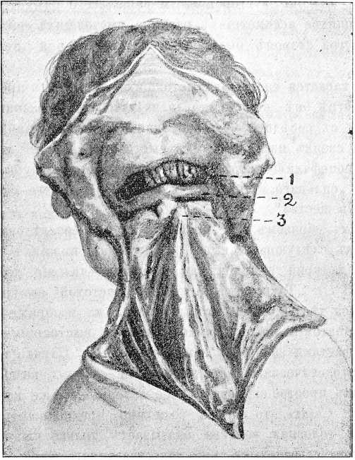 1) Выстоящія части мозжечка; 2) дуга атланта; 3) остистый отростокъ эпистрофея.
