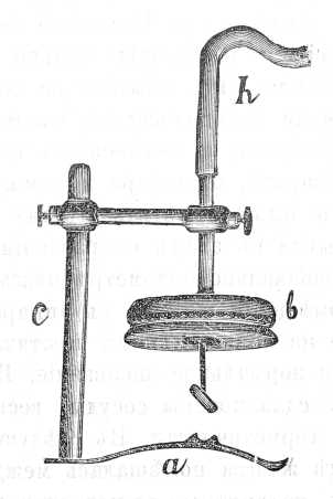 Исходя изъ такого положенія, Brian доказываетъ раціональность операціи на симпатическомъ нервѣ при Базедовой болѣзни. Интересуясь вопросомъ, насколько цѣлесообразна и какія физіологическія основанія имѣетъ перерѣзка симпатическаго нерва и вылущеніе шейнаго (симпатическаго) узла на измѣненіе объема железы при Базедовой болѣзни, и желая, кромѣ того, провѣрить разногласія только что указанныхъ авторовъ, мы поставили рядъ опытовъ на собакахъ. Съ этой цѣлью мы раздражали электрическимъ токомъ подходящіе къ железѣ нервы и наблюдали за измѣненіемъ ея объема, примѣнивъ для этого аппаратъ, благодаря которому измѣненіе объема железы можно было отмѣтить путемъ воздушной передачи. Первыя попытки въ этомъ направленіи были неудачны, примѣненный первоначально онкометръ оказался неудобнымъ, такъ какъ при помѣщеніи железы въ аппаратъ приходилось отсепаровывать ее на значительномъ протяженіи я тѣмъ самымъ измѣнять ее нормальное положеніе. Помимо того, что легко могли быть сдавливаемы сосуды, весьма трудно было достигнуть полной герметичности. Въ слѣдующемъ примѣненномъ аппаратѣ, гдѣ железа помѣщалась между двумя резиновыми пластинками, натянутыми на металлическія чашечки, послѣднее неудобство было устранено, но всѣ остальныя остались, и только съ помощью третьяго аппарата удалось достичь цѣли. Аппаратъ этотъ, работы Verdin’а, употребляется обыкновенно для записыванія веннаго пульса. Состоитъ онъ изъ слегка изогнутой съ небольшимъ желобкомъ (для помѣщенія сосуда) пластинки (а), прикрѣпленной подъ прямымъ угломъ къ стержню (с), по которому можетъ быть свободно перемѣщаться круглая открытая книзу коробка (b), снабженная отводной трубкой (h). На свободные края этой коробки натягивалась очень тонкая резиновая перепонка, къ которой, въ свою очередь, прикрѣпленъ тонкій металлическій стержень съ нѣсколько вогнутой пластинкой на свободномъ концѣ. Изогнутая пластинка, поставленная въ обратномъ положеніи (желобкомъ книзу), подводилась осторожно подъ железу такимъ образомъ, что послѣдняя своимъ длинникомъ помѣщалась поперекъ пластинки; сверху же на железу опускалась металлическая коробка, и железа слегка придавливалась пластинкой стержня, прикрѣпленнаго къ тонкой резиновой перепонкѣ, натянутой на капсулу.