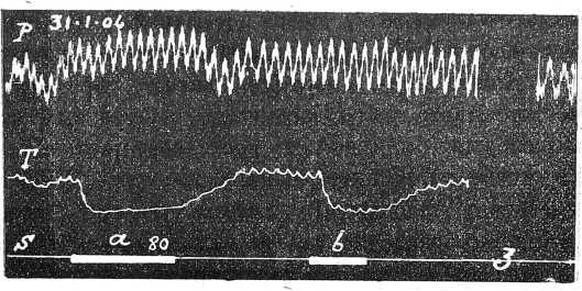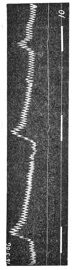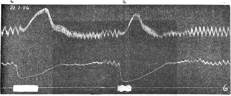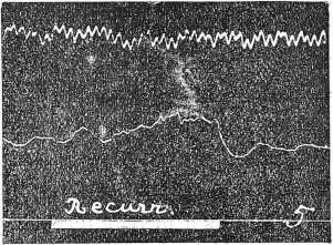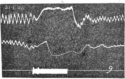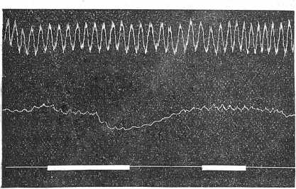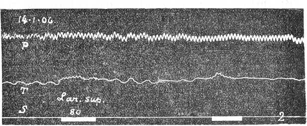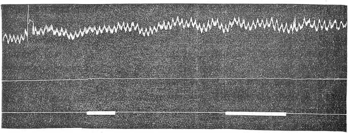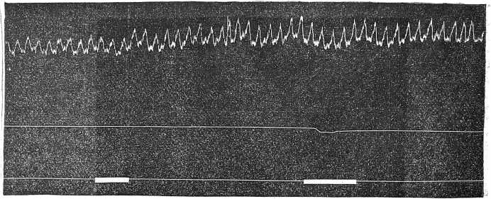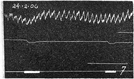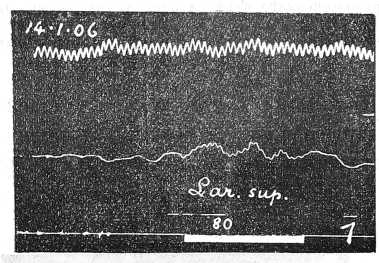 Дальнѣйшее изложеніе протокола опыта мы не считаемъ нужнымъ приводить, такъ какъ чего либо новаго повторныя раздраженія не вносятъ. Раздражаемы были периферическіе отрѣзки laryng. super.,—inferior. и вѣтви отъ узла и laryng. sup. причемъ эти раздраженія дали прежній эффектъ. Кривыя были очень демонстративны. Запись была все время отличная; животное спало хорошо, и только сильные токи вызывали небольшія движенія, которыя, впрочемъ, не препятствовали записи.