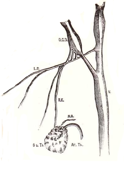 Такимъ образомъ почти всѣ авторы сходятся въ томъ, что оба гортанные нерва имѣютъ прямое отношеніе къ железѣ, нѣкоторые изъ нихъ указываютъ на значеніе перваго шейнаго нерва, glossopbaryngeus’a и только Cyon и Morat et Brіa и принимаютъ, что важное значеніе для железы имѣетъ симпатическій нервъ.