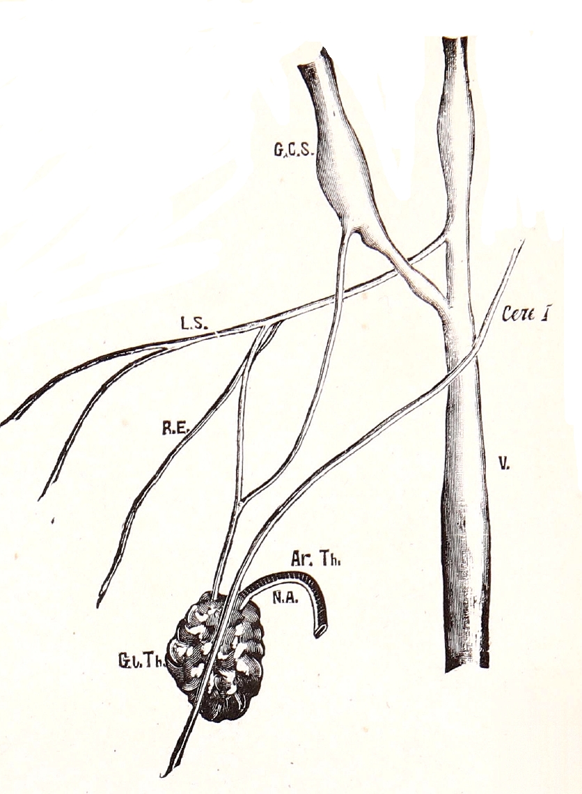 Кромѣ этихъ нервовъ, авторъ считаетъ дѣятельнымъ для железы первый шейный нервъ, развѣтвленія котораго проходятъ по передней поверхности железы и добавляетъ далѣе, что n. hypoglossus даетъ къ общему стволу толстую или тонкую анастомотическую вѣтвь.