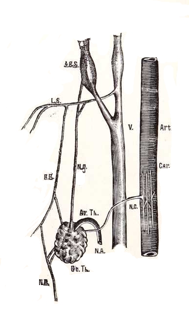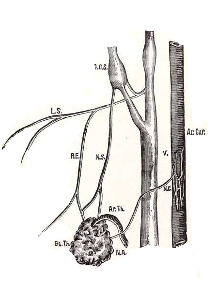 N. glossop h aryngeus послѣ сильнаго анастомоза съ верхнимъ шейнымъ узломъ симпатическаго нерва сзади carotis подходитъ къ мышцамъ глотки. Конечная вѣтвь, лежа на наружной поверхности щитовиднаго хряща, дѣлится у нижняго его края на большое количество вѣтвей, которыя частью соединяются съ вѣтвями п. recurrentis, раньше вступленія въ глотку, частью же, лежа позади развѣтвленія art. thyreoidea super, вступаютъ въ паренхиму железы".